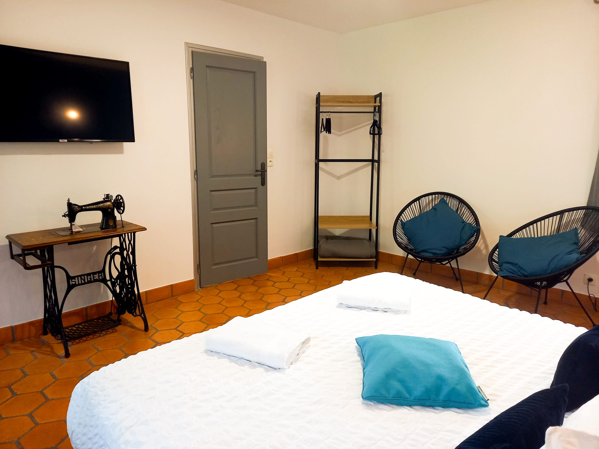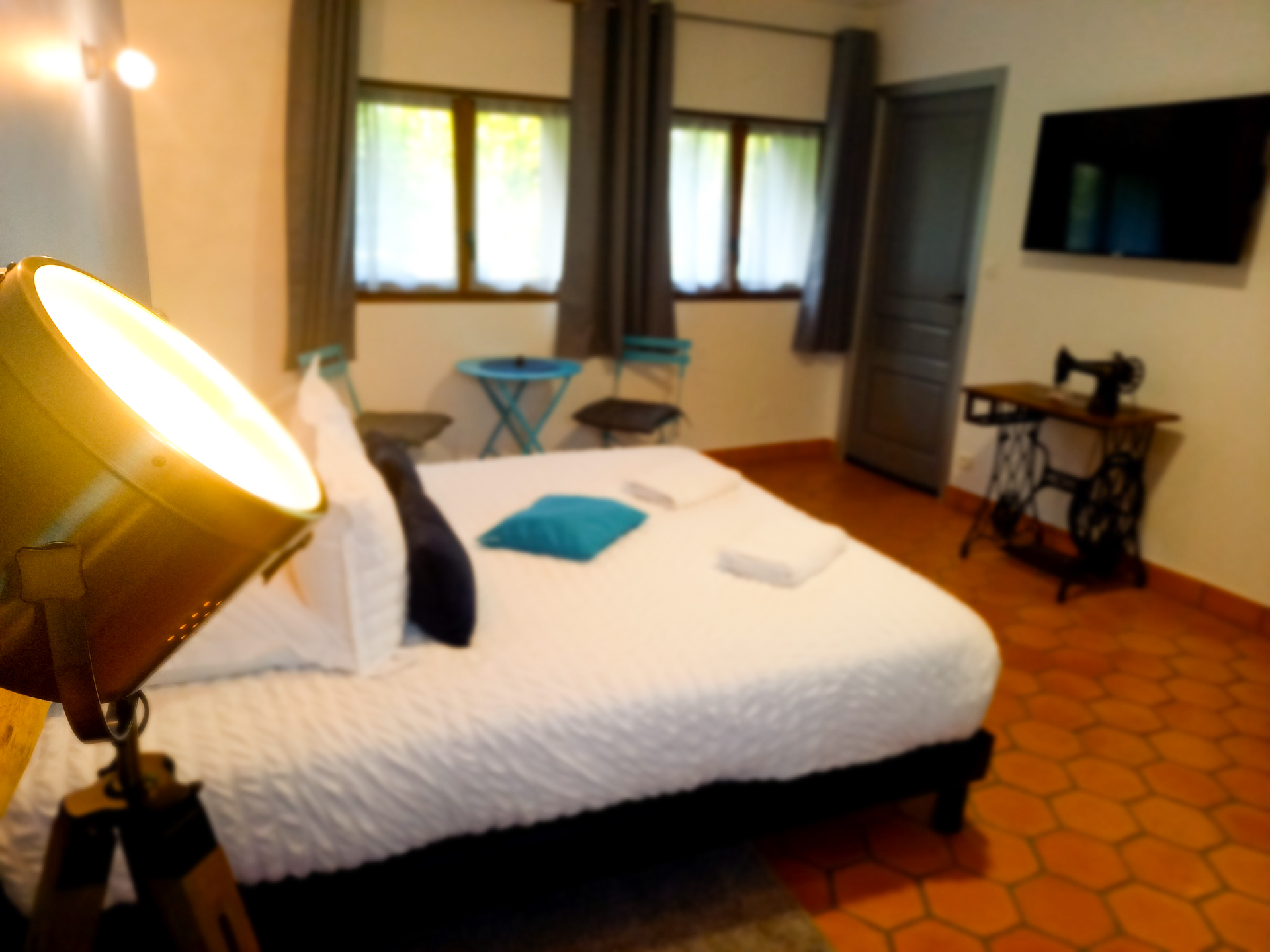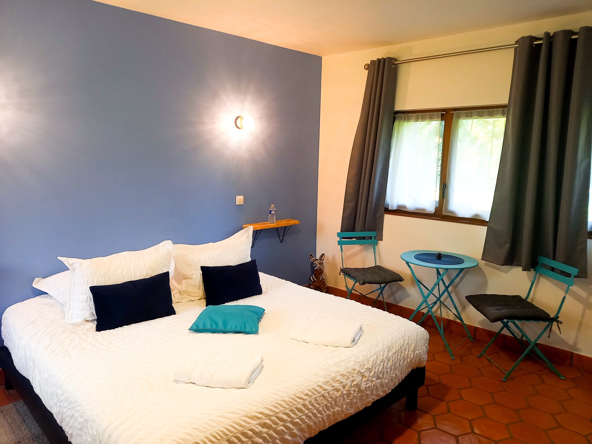 La chambre 4 est située au rez-de-chaussée et possède une vue directe sur le jardin. Elle mesure environ 18m², possède un lit king size 180x200 et un espace repas extérieur sous un préau. Elle est idéale pour 2 personnes.